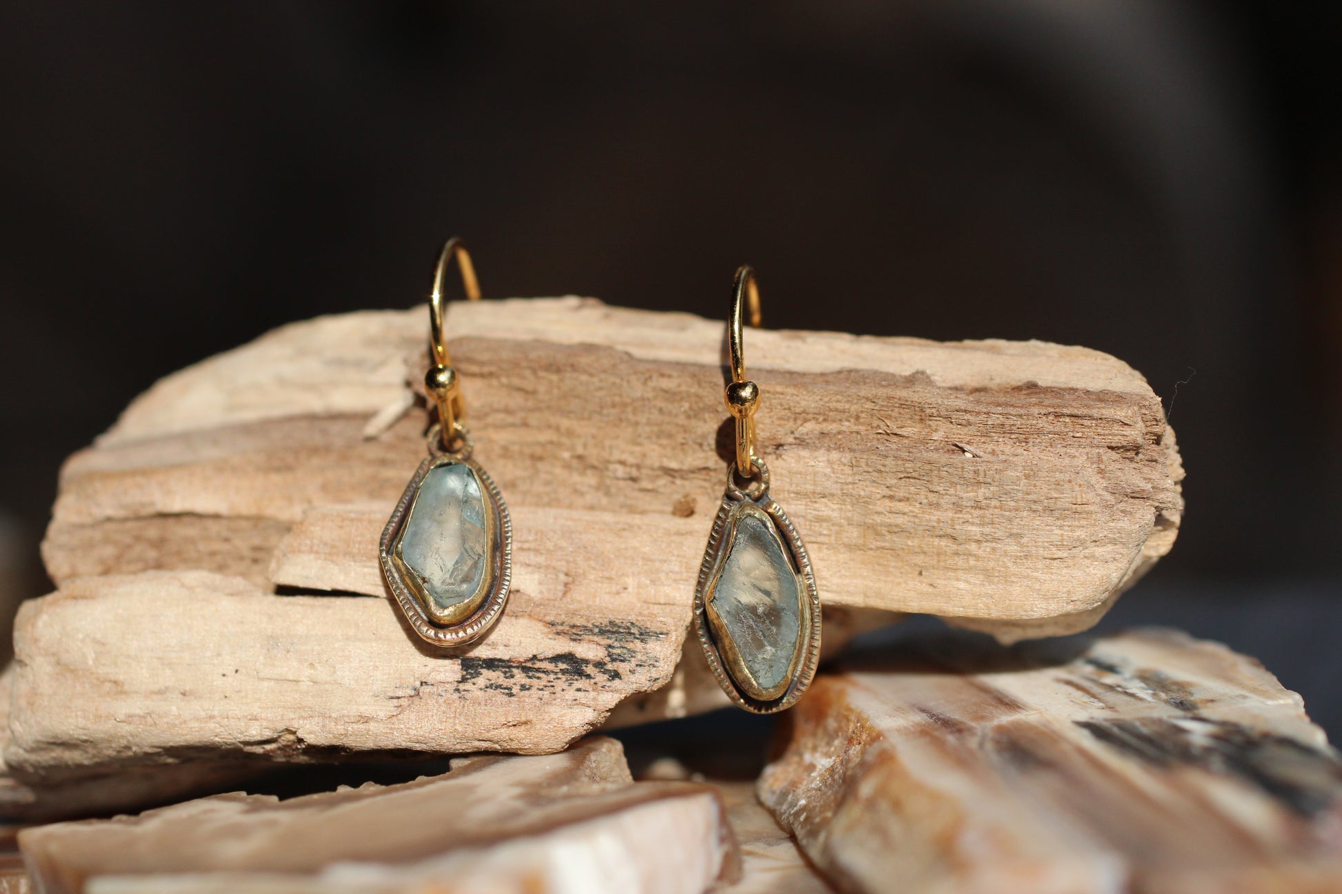 Asymmetrical raw aquamarine placed in brass, and plated with gold. A decorative plate wraps around the piece, and is stamped with emanating rays. Slightly asymmetrical, as the earrings use the natural shapes of the stone to make up their forms. Gold plated hooks.