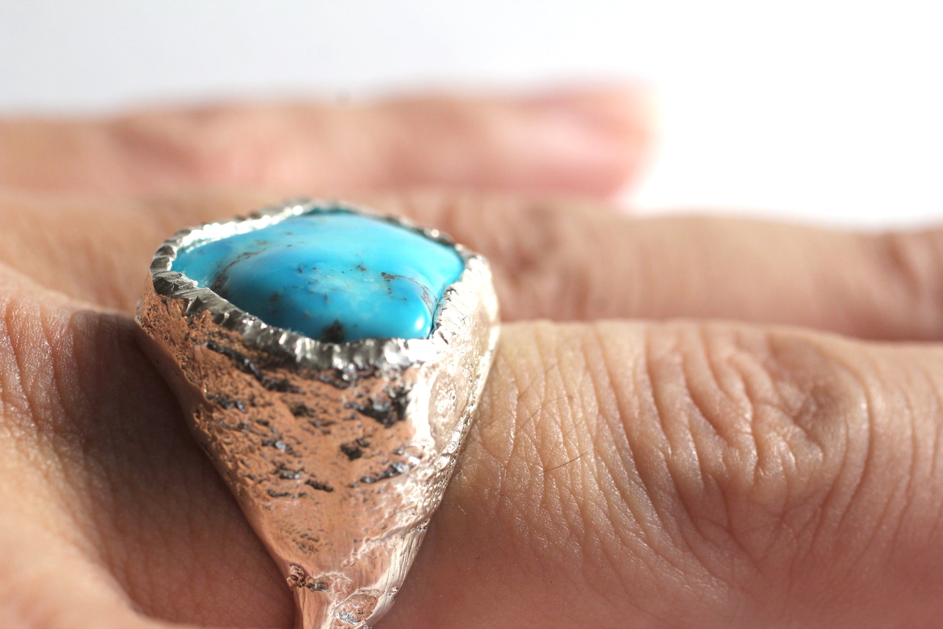 This ring features a highly textured sterling silver band, and a large freeform Sleeping Beauty Turquoise. Rich blue across the entirety of the turquoise, minimal inclusions.