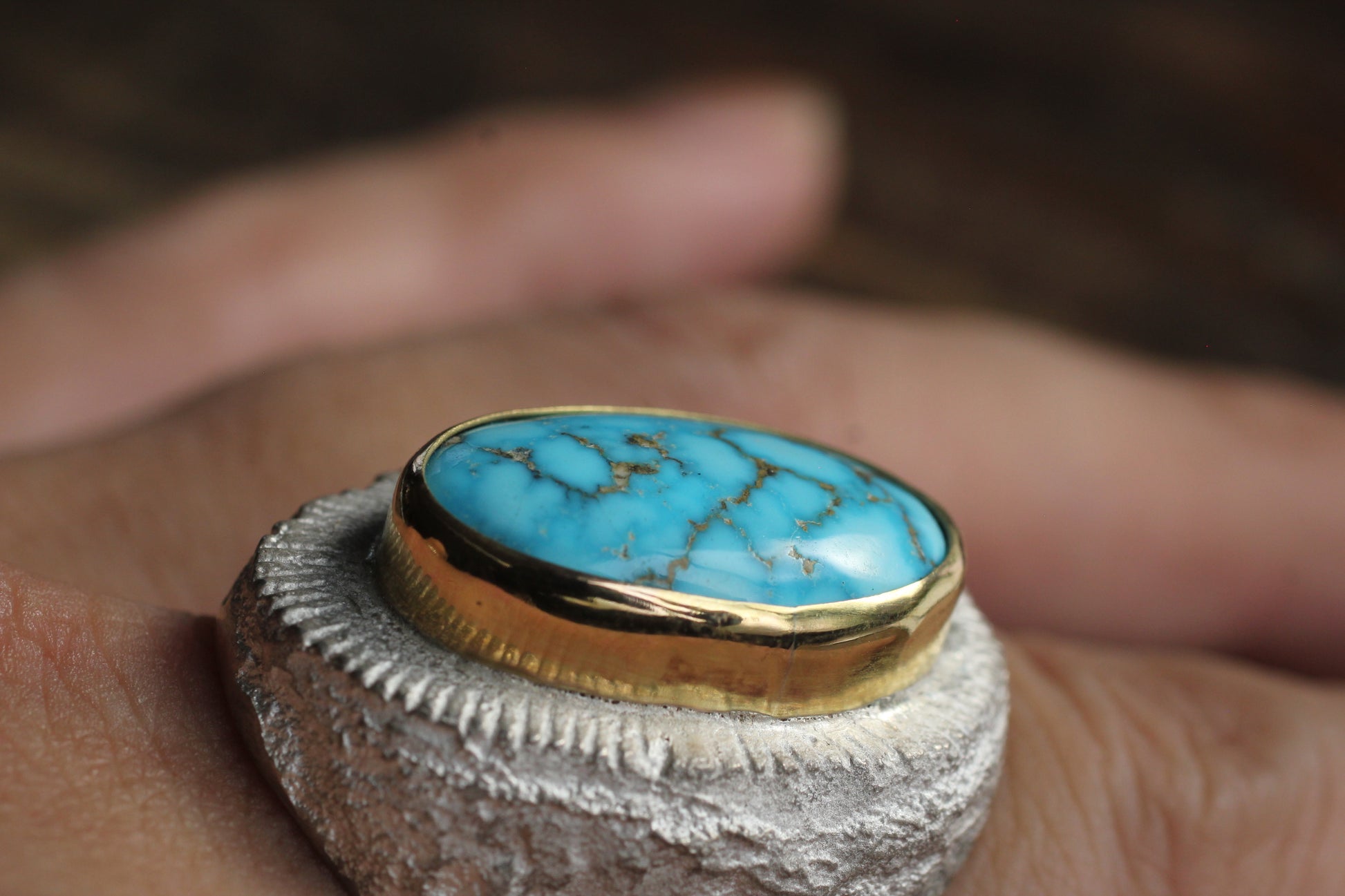 Highly textured white silver, molded and stamped into form. The large Kingman Turquoise held in 14k gold. spider web between the clear blue pieces of turquoise.
